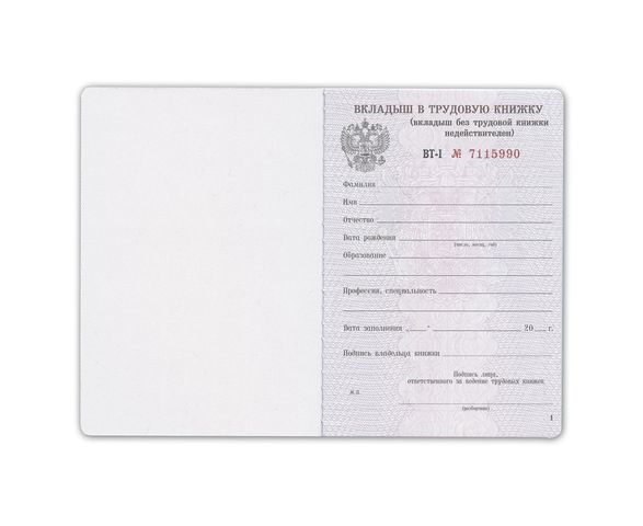 Бланк-вкладыш в трудовую книжку установленного образца с уникальным семизначным номером. Бланк вкладыша имеет соответствующую степень защиты.