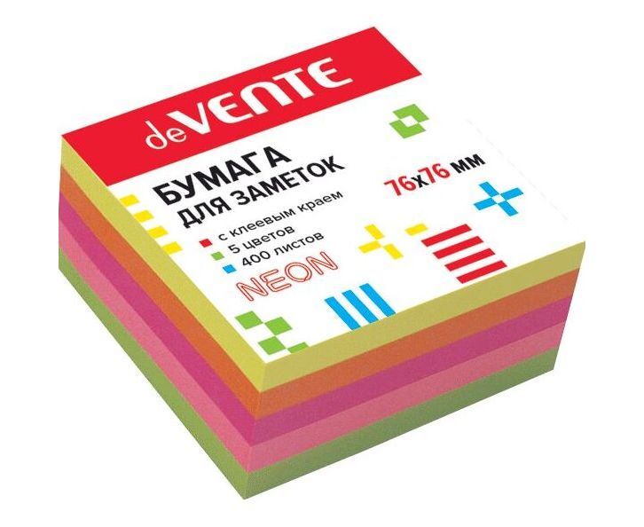 Клейкая бумага для заметок "deVENTE" 76x76 мм, 400 листов, офсет 75 г/м², 5 неоновых цветов - зеленый, оранжевый, малиновый, розовый, желтый.