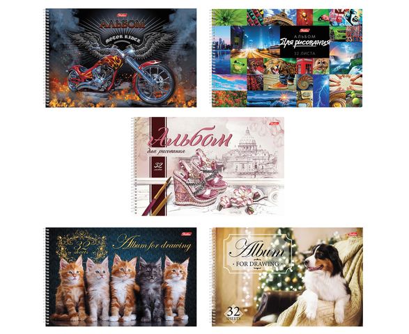 Альбом для рисования. Блок листов - офсетная бумага, формат А4, 32 листа. Перфорация листов для удобного отделения готовых рисунков. Альбом на гребне, обложка - мелованный картон