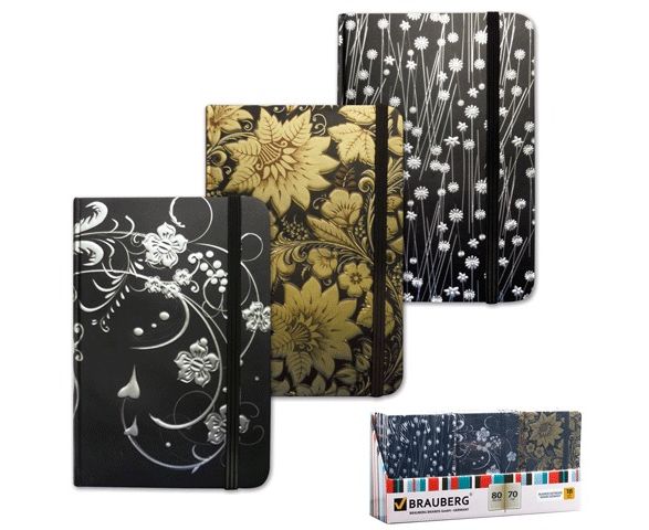 Блокнот А7, 80 л., BRAUBERG, на резинке, металлизированная бумага, клетка, 3 вида, 90х140 мм