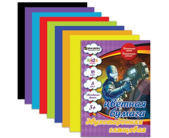 Цветная бумага А4 BRAUBERG, мелов,16л.,8цв.двухсторонняя