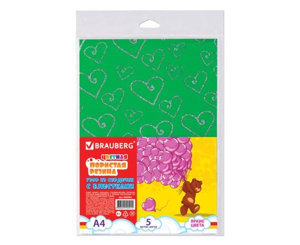 Цветная пористая резина (фоамиран) для творчества А4, толщина 2 мм, BRAUBERG, 5 листов, 5 цветов, се