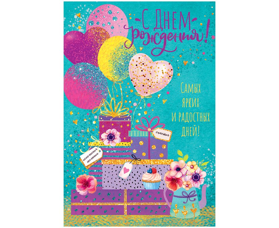 Открытка с готовым текстом - поздравлением внутри. На лицевой стороне располагается надпись «С Днем рождения! Самых ярких и радостных дней!». Фасовка по 10 шт. Размер изделия: 122*182 мм