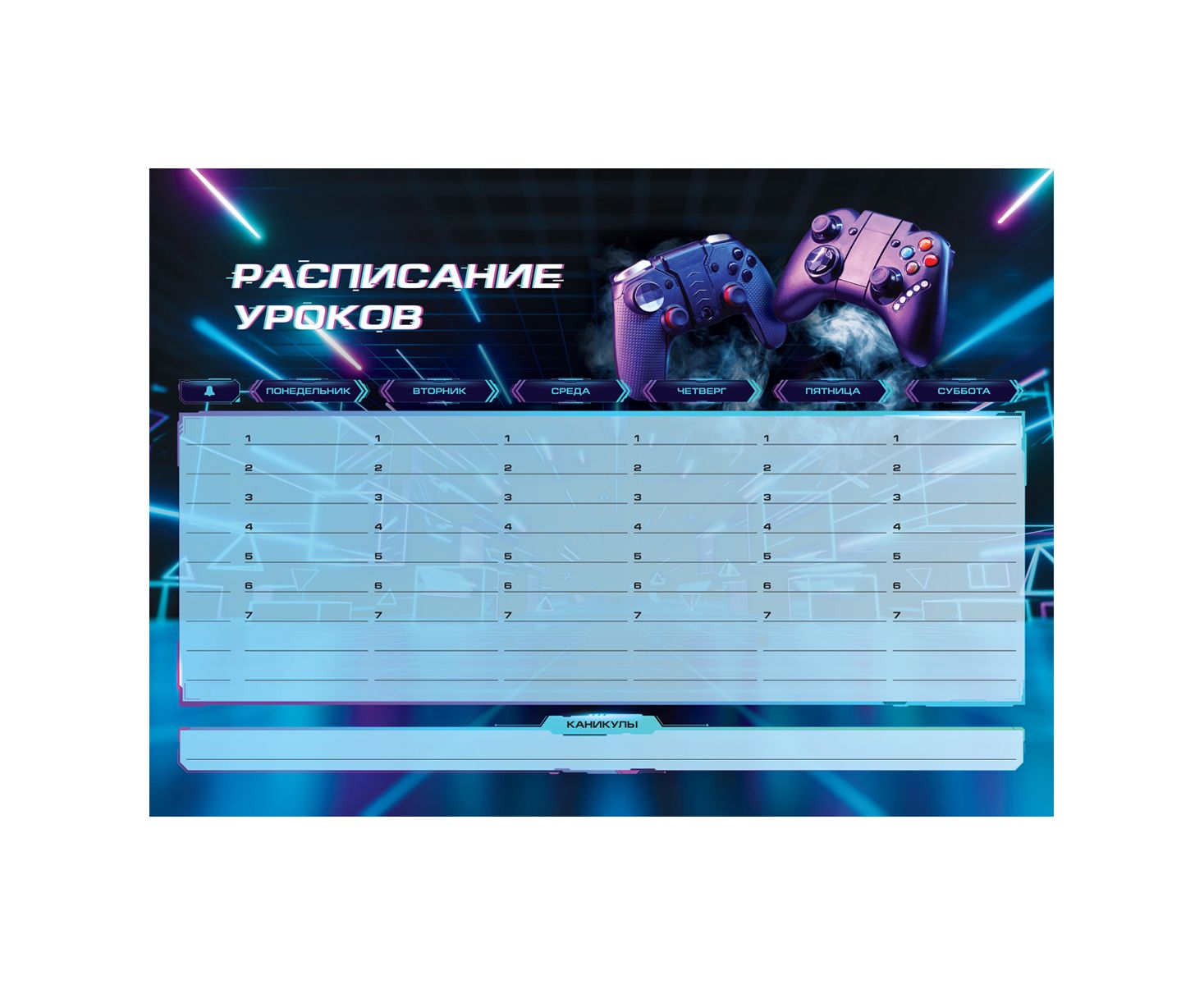 Расписание рассчитано на шестидневную учебную неделю. Каждый день включает семь уроков. В планере есть специальный блок с расписанием звонков, благодаря которому родители будут в курсе точного времени начала и окончания занятий. Предусмотрено место для заметок и блок с расписанием каникул. Дизайн планера с джойстиками понравится мальчику. Комплект упакован в индивидуальный пакет с клеевым краем.