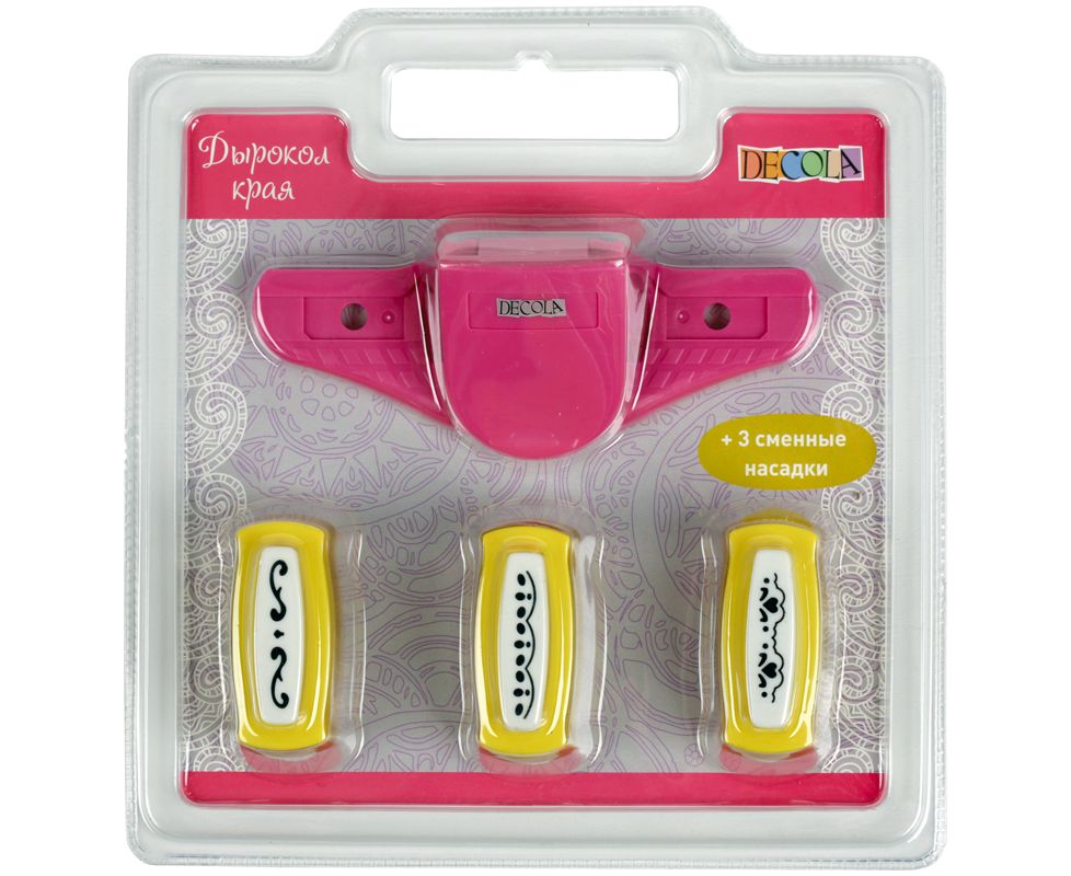 Дырокол края со сменными насадками предназначен для резки непрерывного узора по краю бумаги. Применяется при оформлении подарков, декорировании открыток, пригласительных, фотоальбомов. Поместите лист бумаги в прорезь дырокола и нажмите на кнопку. Рекомендуется использовать в работе бумагу плотностью до 200 г/м². Следует регулярно смазывать лезвия дырокола и производить их своевременную заточку, прокомпостировав, фольгу или мелкую наждачную бумагу. Состав набора: дырокол (1 шт.) + сменные насадки с вырубкой 4,5х1 см (3 шт.).