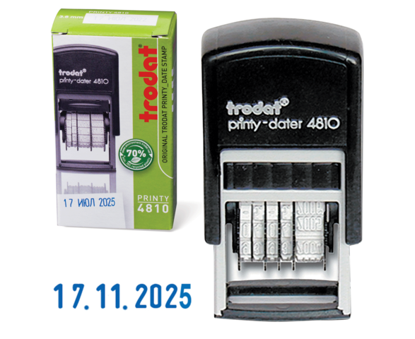 Предназначен для маркировки документов, продукции. Оснастка датера автоматическая, пластиковая. Ленточный механизм включает в себя 4 резиновые ленты (обозначение месяца - числом). Высота букв 3,8 мм, оттиск - 1 строка.