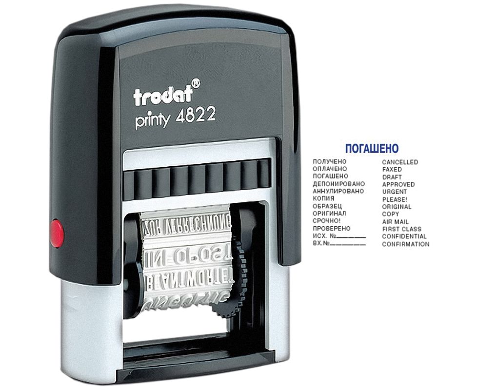 Штамп с 12 бухгалтерскими терминами: ПОЛУЧЕНО, ОПЛАЧЕНО, ПОГАШЕНО, ДЕПОНИРОВАНО, АННУЛИРОВАНО, КОПИЯ, ОБРАЗЕЦ, ОРИГИНАЛ, СРОЧНО! ПРОВЕРЕНО, ИСХ.№__, ВХ.№ __ . Шрифт букв - 4 мм, одна строка.