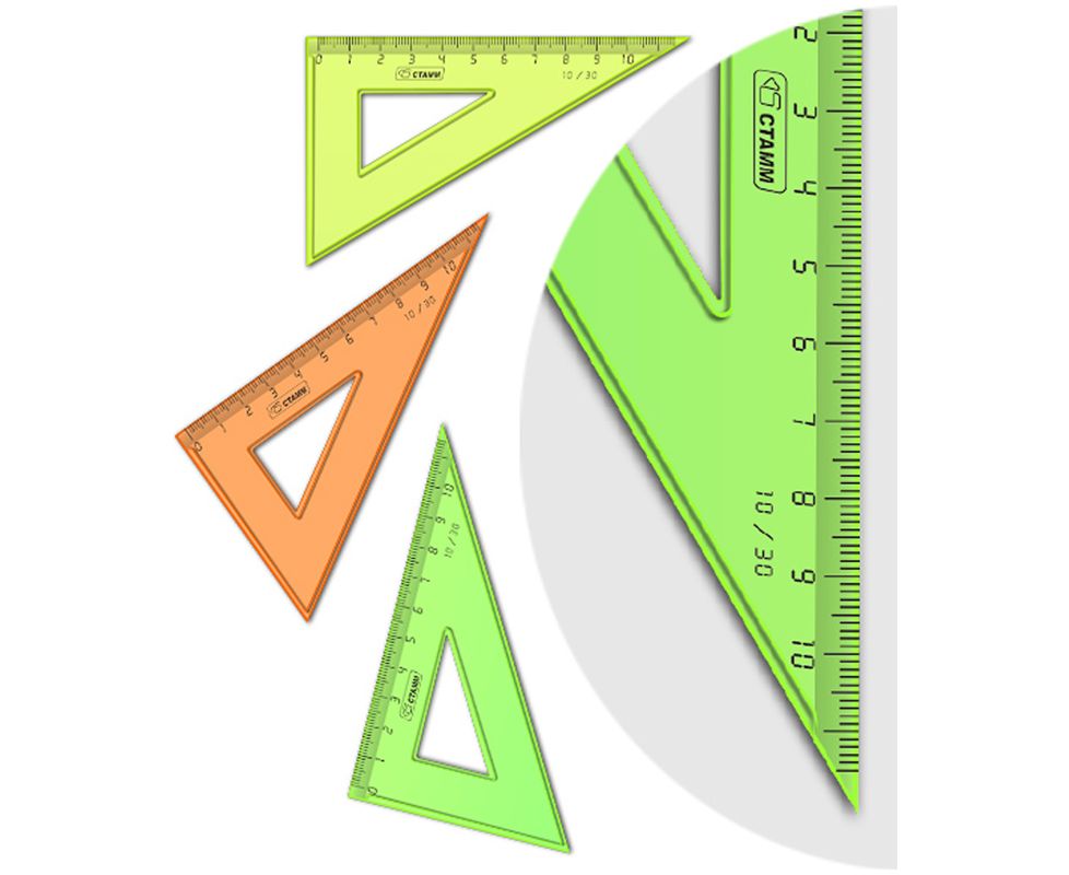 Треугольник 10см, 30°. Предназначен для чертежных работ. Имеет четкую миллиметровую шкалу и безопасные закругленные углы.