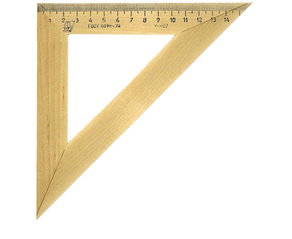 Прямоугольный треугольник с углами при основании 45 градусов. Используется для занятий черчением, построения графиков, проектирования. Длина стороны с делениями 160 мм.