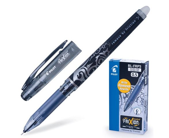 Чернила обесцвечиваются при нагревании. Достаточно потереть надпись резинкой, расположенной на конце корпуса ручки, и надпись исчезнет. При корректировке надписи бумага остается невредимой, можно писать поверх стертого.