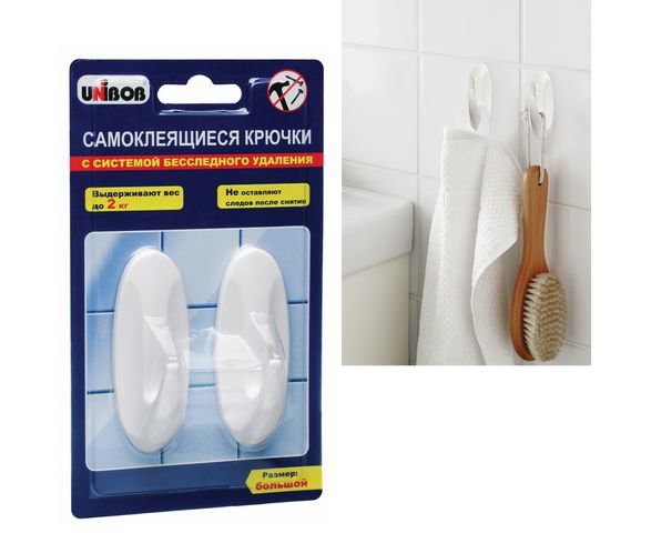 Крючки самоклеящиеся, комплект 2 шт., пластиковые, большие, вес до 2 кг, UNIBOB, белые, блистер