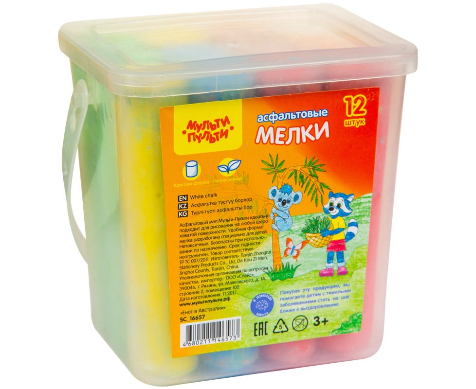 Мел цветной Мульти-Пульти, набор 12шт., для рисования на асфальте, пластиковое ведро