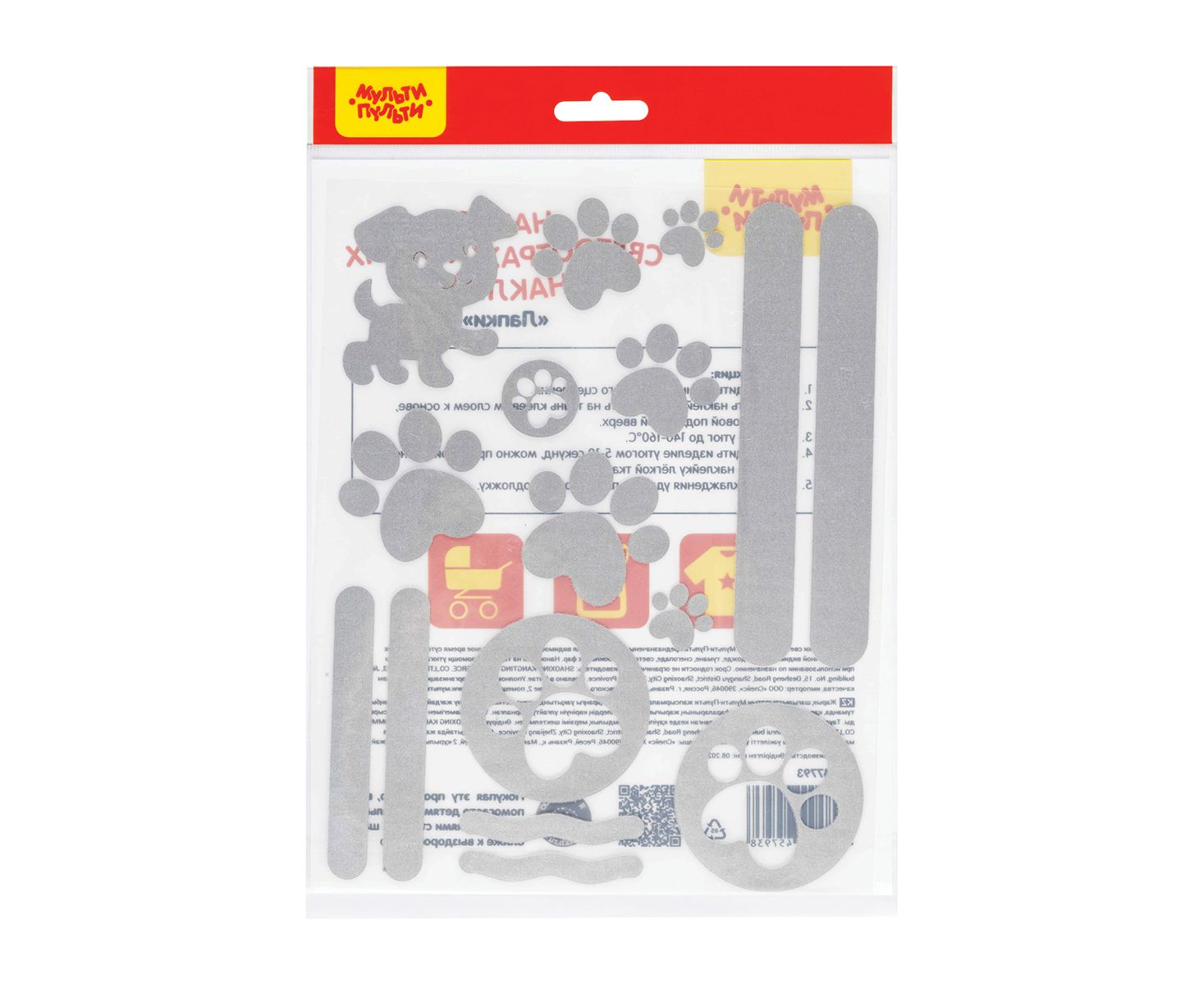 Набор светоотражающих наклеек «Мульти-Пульти» серии «Лапки» сделаны для маркировки элементов одежды и аксессуаров светоотражающими элементами. В наборе16 различных наклеек. При попадании света в темноте наклейки отсвечивают золотистым цветом. Комбинируя различные варианты наклеек, можно получить отличный узор, светящийся в темноте. Подходят для одежды из тканевых материалов, рюкзаков, мешков для обуви, бейсболок и переносятся на поверхность с помощью утюга.