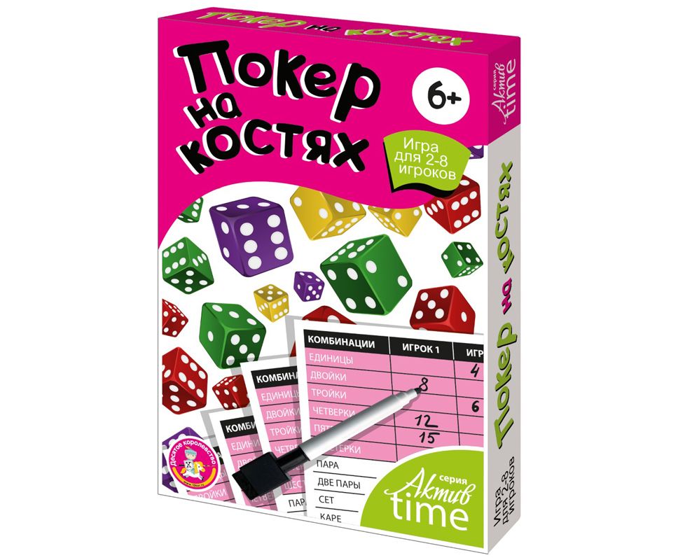 Покер на костях. Состав маркер на водной основе – 1 шт., ламинированная карточка для подсчета очков – 4 шт. (10х14 см.), кости игральные – 5 шт., правила игры – 1 шт.